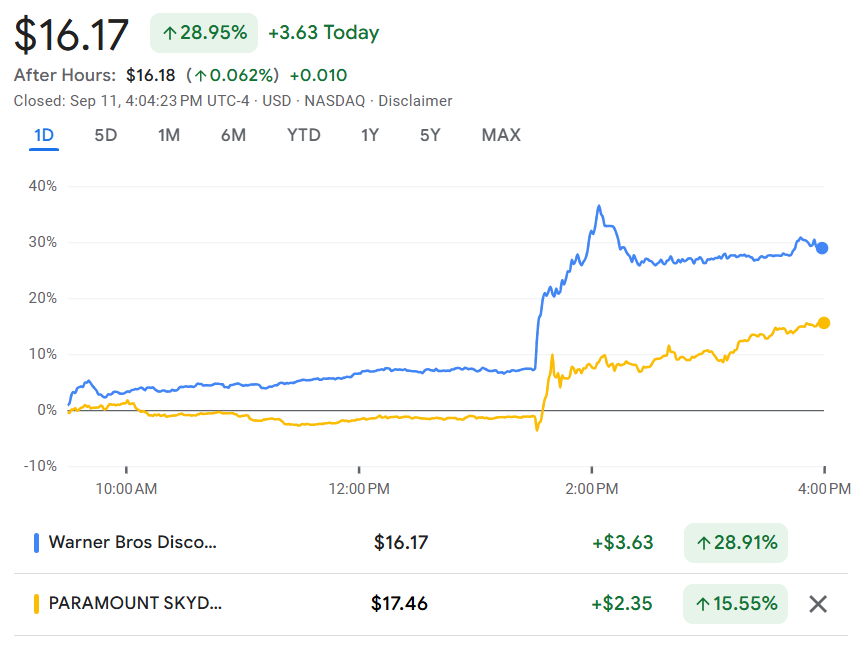 消息传出后,市场反应迅速。华纳兄弟股价飙升近29%,派拉蒙股价在经历短暂下跌后转而上涨,涨幅超15%,至17.46美元。