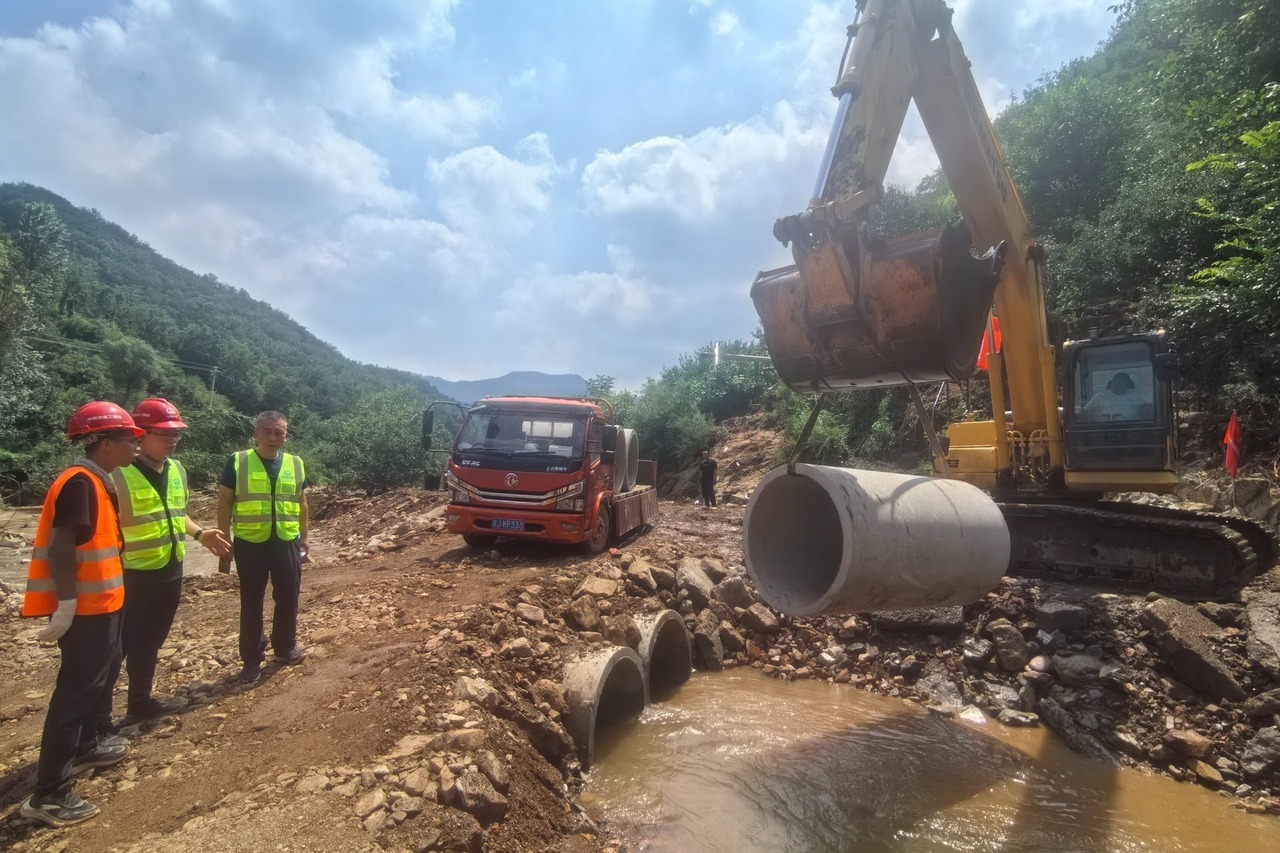 正午的日头晒得路面发烫,西沟路段的谢金召正犯愁:积水半米深,水下全是滑落碎石,得铺涵管引流排水,需要16根2米的过水管。李锟立刻协调:“王铮,联系救援物资,机械、工人配合,去西沟搭把手!”15分钟后,他带着工友赶到,谢金召指挥着挖深排水渠,泥浆溅了满身也顾不上擦。原本要3小时的活儿,1小时就铺好了,积水顺着管道流走,路面渐渐露了出来。